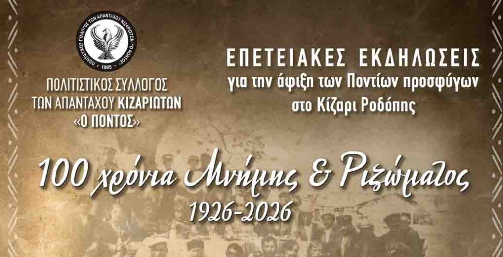 Με βαθύ αίσθημα τιμής, μνήμης και ιστορικής ευθύνης, ο Πολιτιστικός Σύλλογος των Απανταχού Κιζαριωτών «Ο ΠΟΝΤΟΣ» διοργανώνει επετειακές εκδηλώσεις για τη συμπλήρωση 100 χρόνων από την εγκατάσταση των προσφύγων προγόνων στο Κίζαρι Ροδόπης.