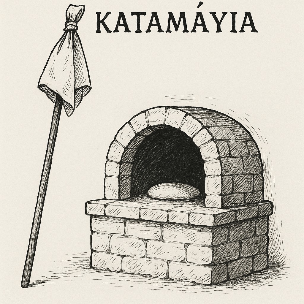καταμάγια, η, ουσκ. κοιν. = πανί με το οποίο καθάριζαν τον πυρωμένο φούρνο, μάζευαν τα υπολείμματα της καύσης, αρχ. κατά + μάσσω = σπογγίζω, σκουπίζω, η πρόθεση κατά επιτείνει τη σημασία της λέξης.