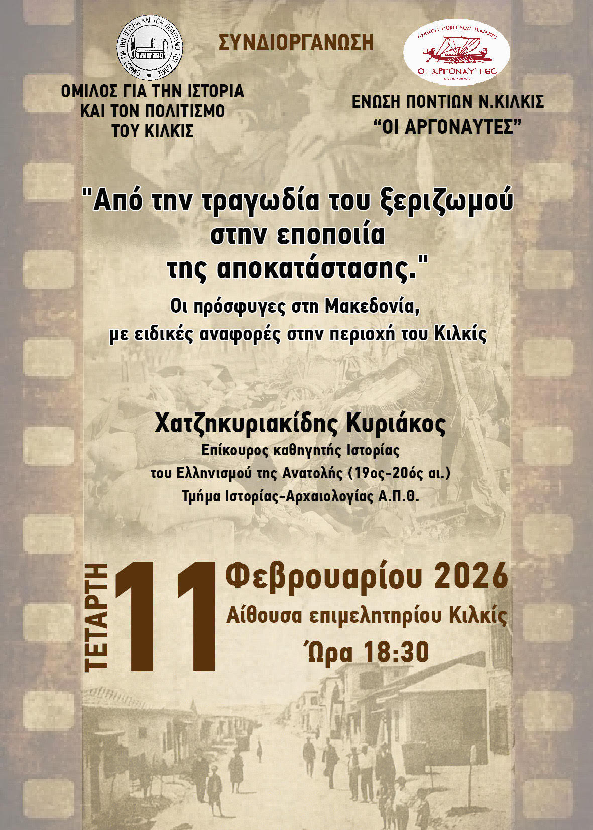 ΑΠΘ αποκατάσταση προσφύγων διαλέξεις ιστορίας Ελληνισμός της Ανατολής Ένωση Ποντίων Κιλκίς ιστορία ιστορία 19ου αιώνα ιστορία 20ού αιώνα ιστορική μνήμη Κιλκίς Μακεδονία Μικρασιατική Καταστροφή Ξεριζωμός Οι Αργοναύτες Όμιλος Ιστορίας και Πολιτισμού Κιλκίς πολιτιστικές εκδηλώσεις Ποντιακός Ελληνισμός Πόντος πρόσφυγες προσφυγικός ελληνισμός