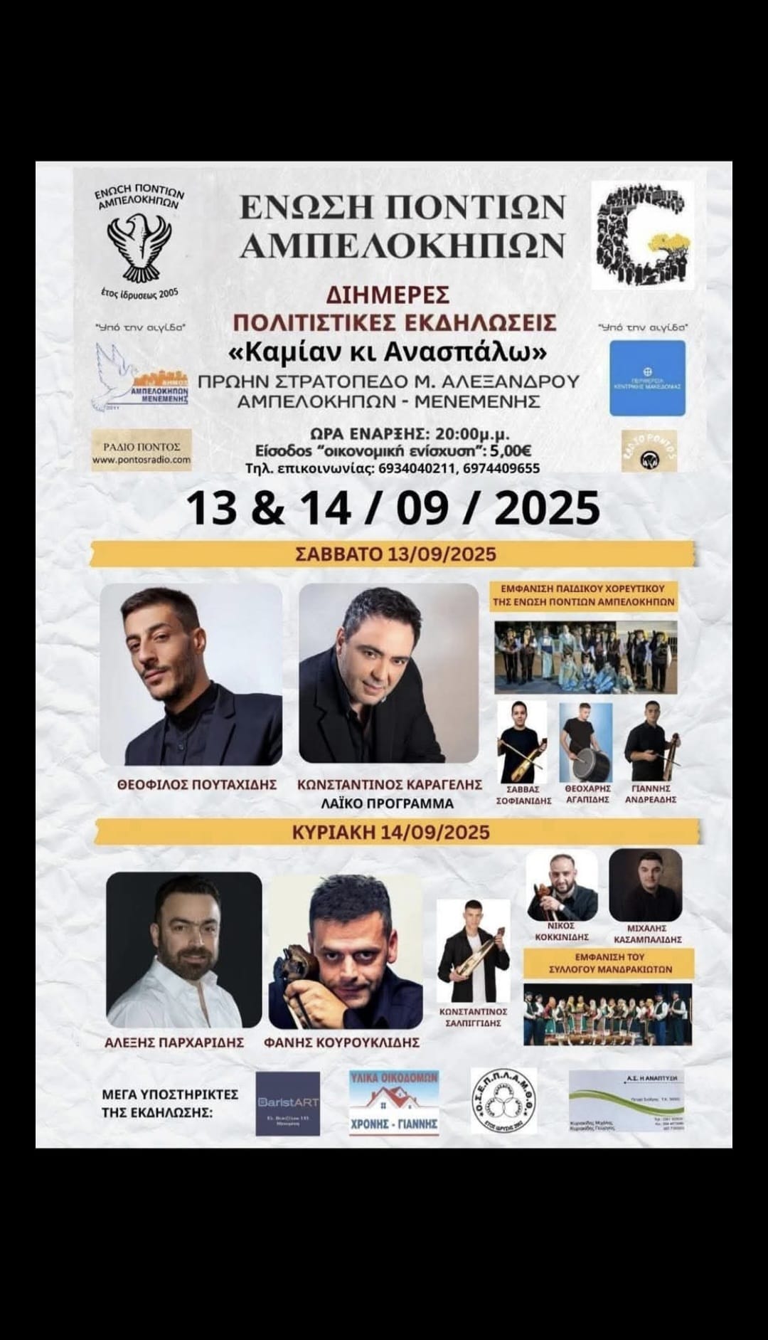 Η Ένωση Ποντίων Αμπελοκήπων διοργανώνει για ακόμη μία χρονιά το μεγάλο της διήμερο πολιτιστικό αντάμωμα με τίτλο «Καμίαν κι Ανασπάλω», το Σάββατο 13 και την Κυριακή 14 Σεπτεμβρίου 2025, στο πρώην Στρατόπεδο Μ. Αλεξάνδρου, στους Αμπελόκηπους – Μενεμένης.