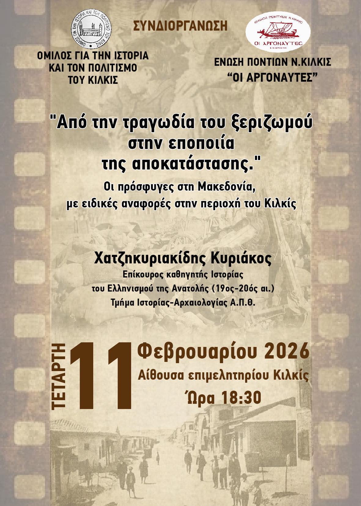 Την Τετάρτη 11 Φεβρουαρίου 2026 πραγματοποιήθηκε στο Επιμελητήριο Κιλκίς, σε συνδιοργάνωση της Ένωσης Ποντίων ν. Κιλκίς «Οι Αργοναύτες» και του Ομίλου για την Ιστορία και τον Πολιτισμό του Κιλκίς, εκδήλωση με θέμα: «Από την τραγωδία του ξεριζωμού στην εποποιία της αποκατάστασης. Οι πρόσφυγες στη Μακεδονία, με ειδικές αναφορές στην περιοχή του Κιλκίς».