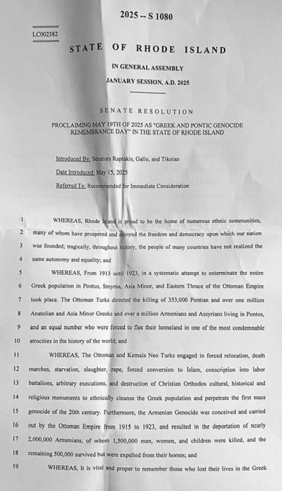 Κατά τη διάρκεια της συνάντησης, ο κ. Ραπτάκης παρέδωσε το ψήφισμα της Γενικής Συνέλευσης της Γερουσίας του Rhode Island (19 Μαΐου 2025), με το οποίο αναγνωρίζεται ότι τα γεγονότα της περιόδου 1914-1923 εις βάρος Αρμενίων, Ασσυρίων και Ελλήνων της Μικράς Ασίας και του Πόντου από Νεότουρκους και Κεμαλικούς συνιστούν πράξεις Γενοκτονίας, σύμφωνα με το άρθρο 2 της Σύμβασης του ΟΗΕ του 1948.