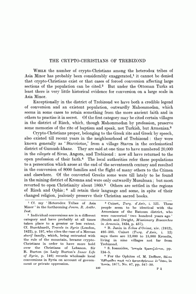 Οι Κρυπτοχριστιανοί με ελληνικό τυπικό και ελληνική γλώσσα υπήρχαν μέχρι και πρόσφατα (σε σχέση με την εποχή που γράφει), κυρίως γύρω από την Τραπεζούντα.