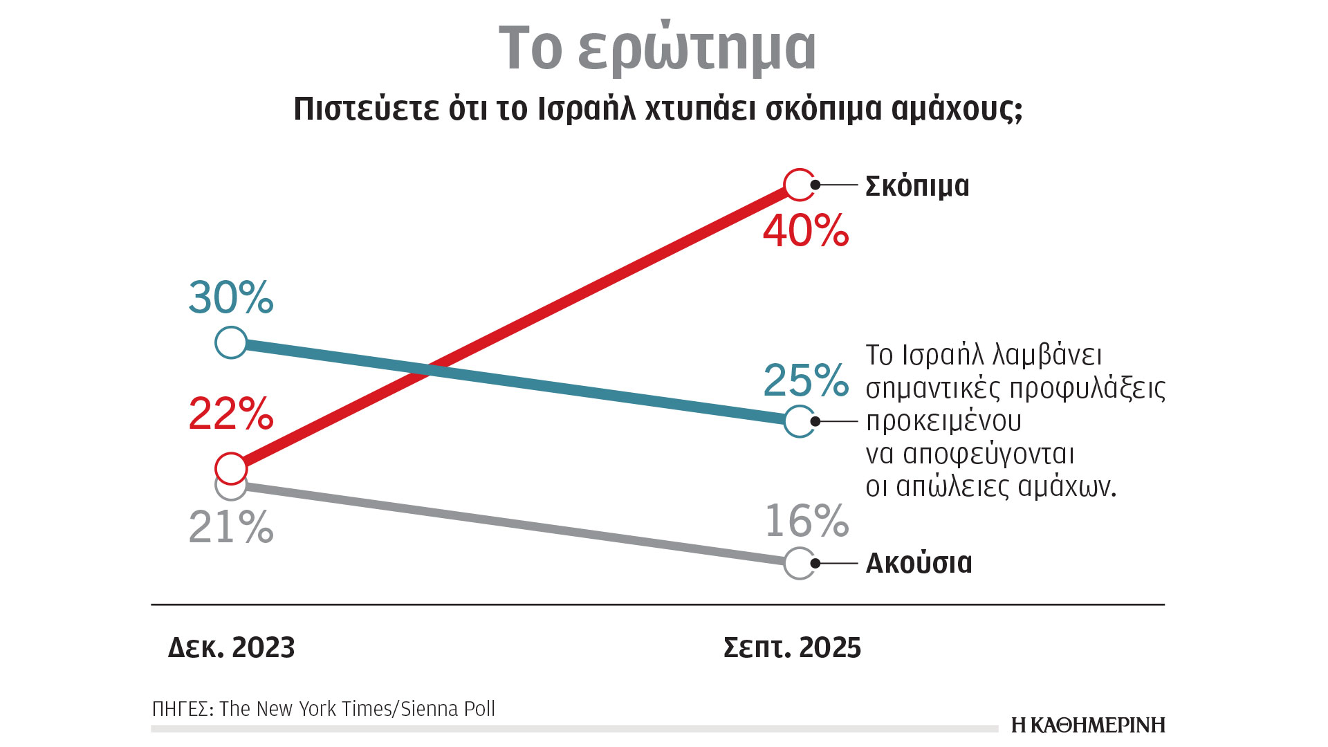 Στον απόηχο των φονικών επιθέσεων της 7ης Οκτωβρίου, οι Αμερικανοί έπαιρναν το μέρος των Ισραηλινών αντί των Παλαιστινίων σε ποσοστό 47% και 20% αντιστοίχως. Στη νέα έρευνα, το 34% δηλώνει πως στηρίζει το Ισραήλ και το 35% την Παλαιστίνη. Ενα 31% απαντά «και τους δύο το ίδιο».