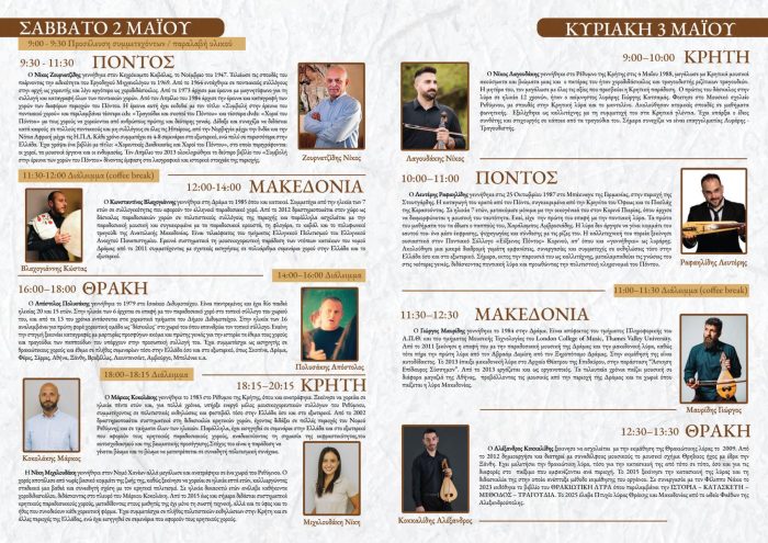 Η Κυριακή είναι αφιερωμένη στη μουσική και ειδικότερα στη λύρα, το όργανο που συνδέει τις τέσσερις περιοχές. Στις 9:00 το πρωί ο Νίκος Λαγουδάκης θα παρουσιάσει την κρητική λύρα, ενώ στις 10:00 θα ακολουθήσει ο πόντιος λυράρης Λευτέρης Ραφαηλίδης, ο οποίος θα αναδείξει τον ιδιαίτερο ήχο και τον τρόπο έκφρασης της ποντιακής μουσικής παράδοσης. Μετά το διάλειμμα, στις 11:30, ο Γιώργος Μαυρίδης, λυράρης και κατασκευαστής μακεδονικής λύρας, θα αναφερθεί στις δικές του καταγραφές και στη μακρά διαδρομή του οργάνου στην περιοχή της Δράμας. Ο κύκλος των εισηγήσεων θα κλείσει με τον Αλέξανδρο Κοκκαλίδη, ο οποίος, ως λυράρης και κατασκευαστής, θα παρουσιάσει τη θρακιώτικη λύρα και τα επιμέρους χαρακτηριστικά της. Κάθε εισηγητής θα έχει στη διάθεσή του μία ώρα, προκειμένου να παρουσιάσει το όργανο, να δώσει πληροφορίες για την ιστορία και τη χρήση του και να παραδώσει ένα πρακτικό μάθημα στους συμμετέχοντες.