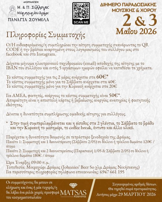 Ιδιαίτερο βάρος δίνεται στο σεμινάριο, για το οποίο οι ενδιαφερόμενοι μπορούν να υποβάλουν αίτηση συμμετοχής έως τις 29 Μαρτίου 2026, είτε σκανάροντας το QR code της αφίσας είτε μέσω της σχετικής φόρμας που έχει αναρτηθεί στους λογαριασμούς του συλλόγου σε Facebook και Instagram. Παράλληλα, προβλέπεται και δυνατότητα ομαδικής αίτησης για συλλόγους. Όσοι ολοκληρώσουν την αίτησή τους, καταβάλουν τη συμμετοχή τους και λάβουν μέρος στο σεμινάριο, θα μπουν και σε κλήρωση για ένα ρολόι χειρός, προσφορά του κοσμηματοπωλείου «ΜΑΤΣΑΣ».