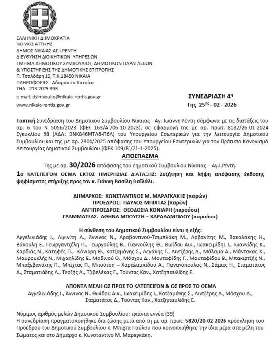Το Δημοτικό Συμβούλιο Νίκαιας – Αγ. Ι. Ρέντη προχώρησε σε μια εξέλιξη με σαφή πολιτικό και θεσμικό βάρος, υιοθετώντας ομόφωνα ψήφισμα στήριξης για τον Γιάννη Βασίλη Γαϊλάλι, όπως γνωστοποίησε η Ένωση Ποντίων Νίκαιας Κορυδαλλού. Σύμφωνα με την ανακοίνωση, το ψήφισμα έχει πλέον καθαρογραφεί επίσημα, γεγονός που «κλειδώνει» τη θέση του Δήμου σε επίπεδο θεσμικής καταγραφής.