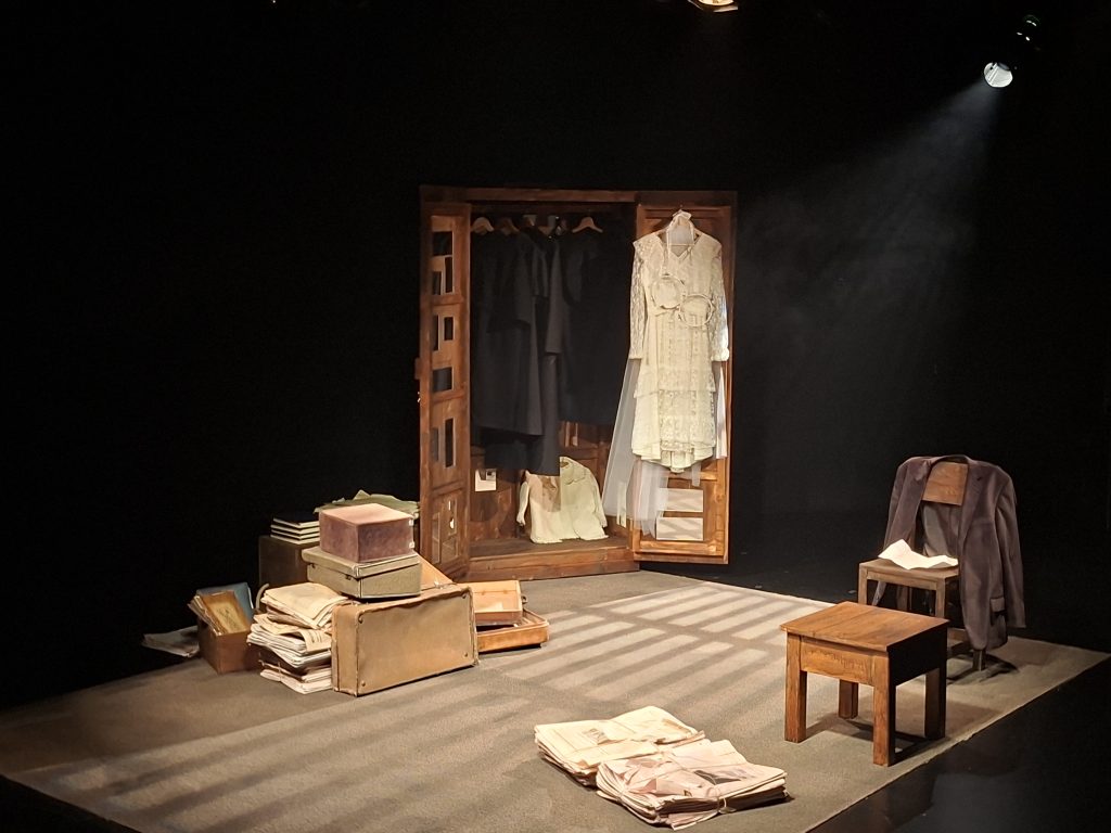 Το σκηνικό λιτό και απέριττο! Ένα δωμάτιο με μια παλιά ντουλάπα, ένα σεντούκι, μια καρέκλα, ένα σκαμπό και στίβες με βιβλία και παλιές εφημερίδες, ενώ σε τακτά μέρη ακούγεται (μαγνητοσκοπημένα) η λύρα και η φωνή του Δημήτρη Καρασσαβίδη. Ο ηθοποιός εισέρχεται στο ημισκότεινο χώρο. Η σιωπή είναι ο πρόλογος της αφήγησής του. Αποτυπώνει τον βουβό πόνο όσων ξεριζώθηκαν. Κεντρικό πρόσωπο είναι η γιαγιά του ήρωα, η Παρθένα, η ιστορία της οποίας ξεκινά με το άνοιγμα της παλιάς ντουλάπας. Κάθε ρούχο που βγαίνει από εκεί μέσα είναι και ένα κομμάτι της. Το νυφικό, το παιδικό σακάκι, το ματωμένο πουκάμισο του γιου της που σκότωσαν οι αντάρτες στον εμφύλιο.