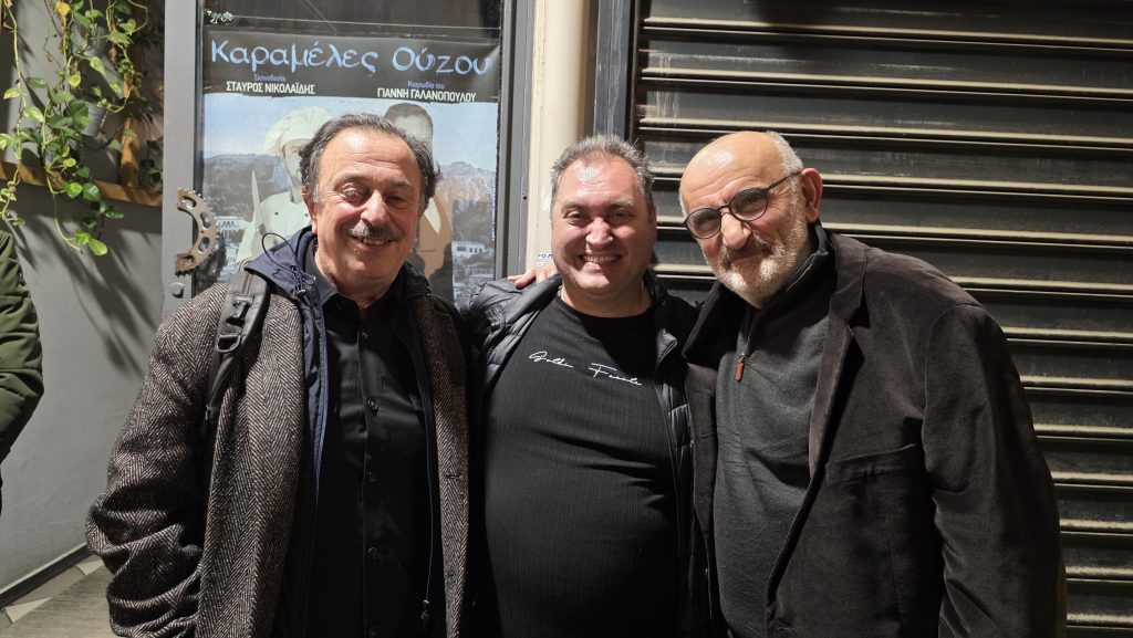 Ο σκηνοθέτης Θέμης Μουμουλίδης με τον λυράρη και τραγουδιστή Δημήτρη Καρασσαβίδη και τον πρωταγωνιστή της παράστασης Τάκη Βαμβακίδη στην πρεμιέρα. “Ροδάφ’νον” | Φώτο: Χρήστος Κωνσταντινίδης – Pontos Voice