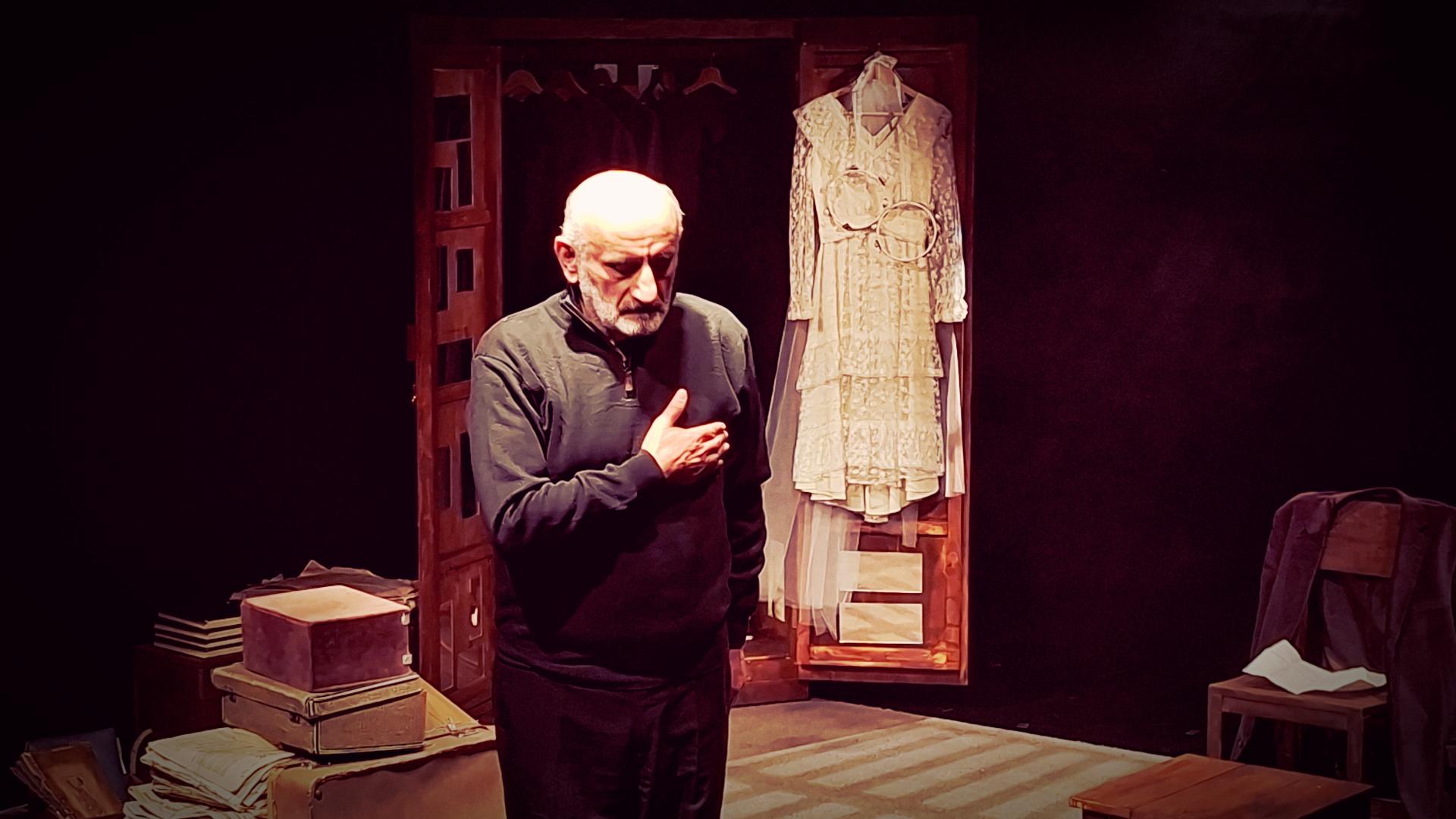 Το σκηνικό λιτό και απέριττο! Ένα δωμάτιο με μια παλιά ντουλάπα, ένα σεντούκι, μια καρέκλα, ένα σκαμπό και στίβες με βιβλία και παλιές εφημερίδες, ενώ σε τακτά μέρη ακούγεται (μαγνητοσκοπημένα) η λύρα και η φωνή του Δημήτρη Καρασσαβίδη. Ο ηθοποιός εισέρχεται στο ημισκότεινο χώρο. Η σιωπή είναι ο πρόλογος της αφήγησής του. Αποτυπώνει τον βουβό πόνο όσων ξεριζώθηκαν. Κεντρικό πρόσωπο είναι η γιαγιά του ήρωα, η Παρθένα, η ιστορία της οποίας ξεκινά με το άνοιγμα της παλιάς ντουλάπας. Κάθε ρούχο που βγαίνει από εκεί μέσα είναι και ένα κομμάτι της. Το νυφικό, το παιδικό σακάκι, το ματωμένο πουκάμισο του γιου της που σκότωσαν οι αντάρτες στον εμφύλιο.