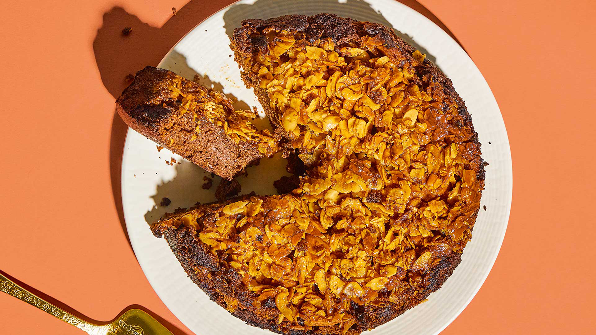 Αδειάζουμε το μείγμα πάνω από τα αμύγδαλα στο ταψάκι, απλώνοντάς το ομοιόμορφα. Ψήνουμε για περίπου 1 ώρα και ελέγχουμε αν είναι έτοιμο βυθίζοντας μια οδοντογλυφίδα στο κέντρο του: θα πρέπει να βγει με λίγα νωπά ψίχουλα κολλημένα πάνω της. Βγάζουμε το κέικ από τον φούρνο και το αφήνουμε να κρυώσει για 30 λεπτά μέσα στο ταψάκι. Το αναποδογυρίζουμε σε σχάρα ή σε πιάτο σερβιρίσματος, έτσι ώστε τα αμύγδαλα να είναι από πάνω, και αφαιρούμε προσεκτικά τη λαδόκολλα. Αν πέσουν αμύγδαλα, τα επανατοποθετούμε στην επιφάνεια. Αφήνουμε να κρυώσει εντελώς για περίπου 30 λεπτά πριν το σερβίρουμε.
