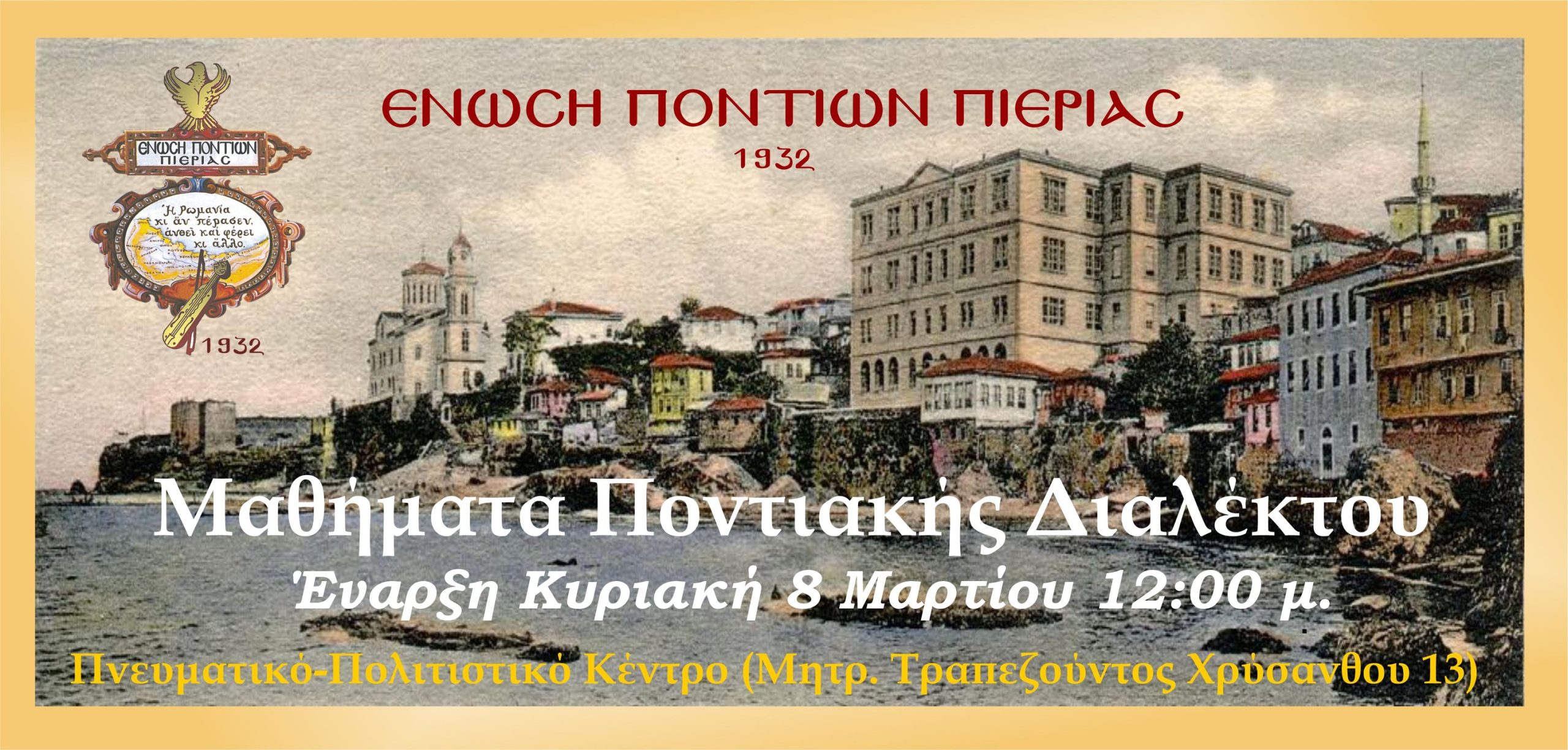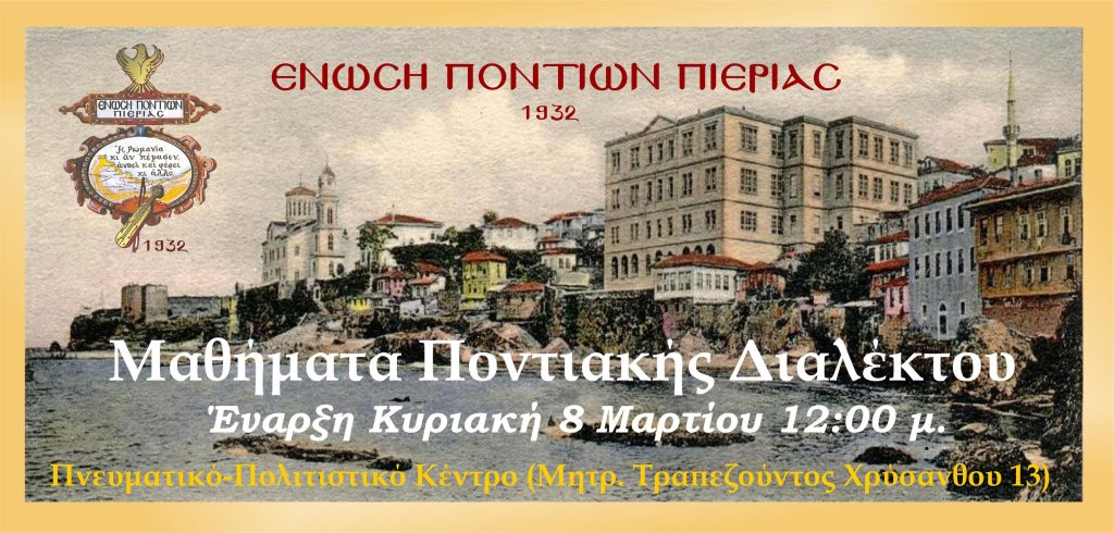 Η Ένωση Ποντίων Πιερίας ξεκινά νέο κύκλο δωρεάν μαθημάτων ποντιακής διαλέκτου την Κυριακή 8 Μαρτίου 2026 (12:00), με στόχο να κρατηθεί ζωντανή η γλώσσα που είναι ο πιο βαθύς πυρήνας της ποντιακής ταυτότητας.
