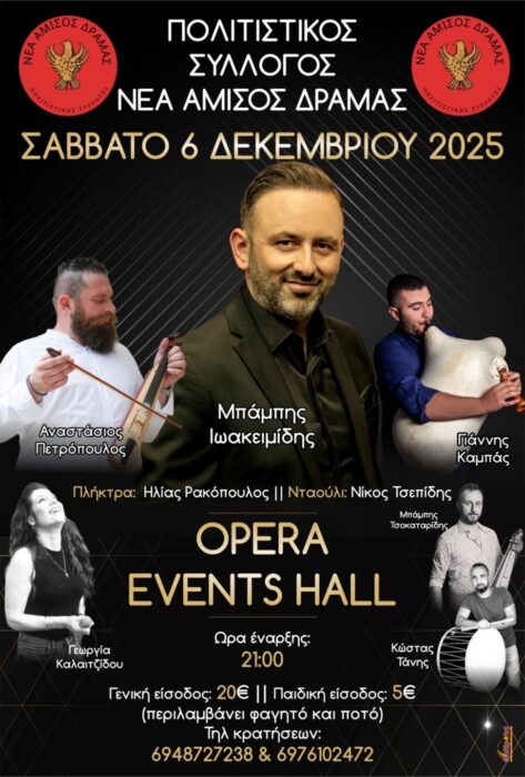 Ο Πολιτιστικός Σύλλογος Νέα Αμισός Δράμας ανακοινώνει τη διοργάνωση μεγάλης μουσικοχορευτικής εκδήλωσης το Σάββατο 6 Δεκεμβρίου 2025, η οποία θα πραγματοποιηθεί στην αίθουσα Opera Events Hall. Στη βραδιά θα συμμετάσχουν διακεκριμένοι καλλιτέχνες της ποντιακής μουσικής, προσφέροντας μια υπέροχη βραδιά.