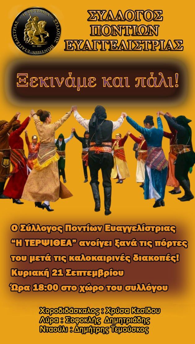 Μετά τις καλοκαιρινές διακοπές, ο Σύλλογος Ποντίων Ευαγγελίστριας «Η Τερψιθέα» επιστρέφει δυναμικά, ανοίγοντας ξανά τις πόρτες του και καλώντας τα μέλη και τους φίλους του να ενωθούν σε μια μεγάλη γιορτή παράδοσης και πολιτισμού.