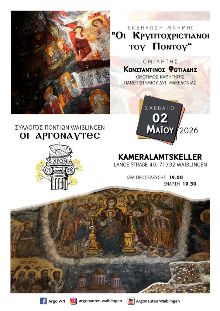 Ο Σύλλογος Ποντίων Waiblingen «Οι Αργοναύτες» διοργανώνει εκδήλωση μνήμης με θέμα «Οι Κρυπτοχριστιανοί του Πόντου»,…