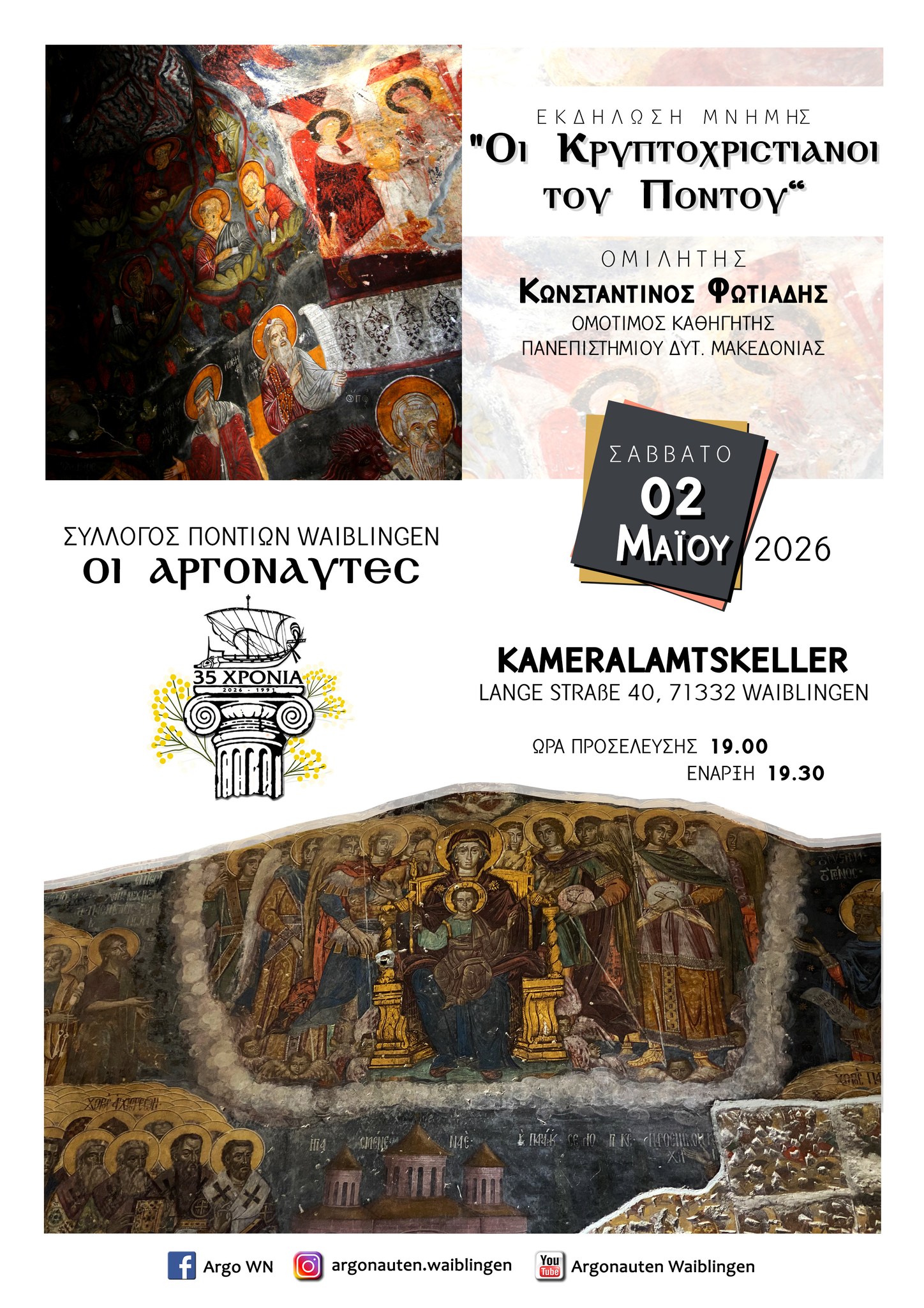 Ο Σύλλογος Ποντίων Waiblingen «Οι Αργοναύτες» διοργανώνει εκδήλωση μνήμης με θέμα «Οι Κρυπτοχριστιανοί του Πόντου», αναδεικνύοντας μια από τις πιο ιδιαίτερες και βαθιές πτυχές της ιστορικής διαδρομής του Ποντιακού Ελληνισμού.