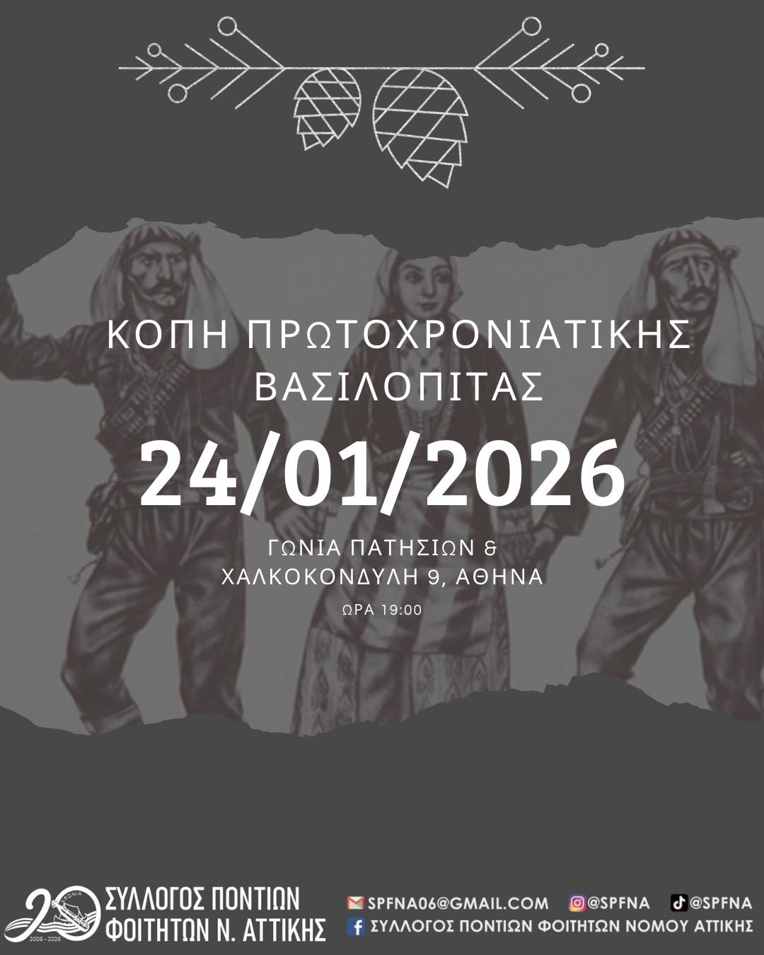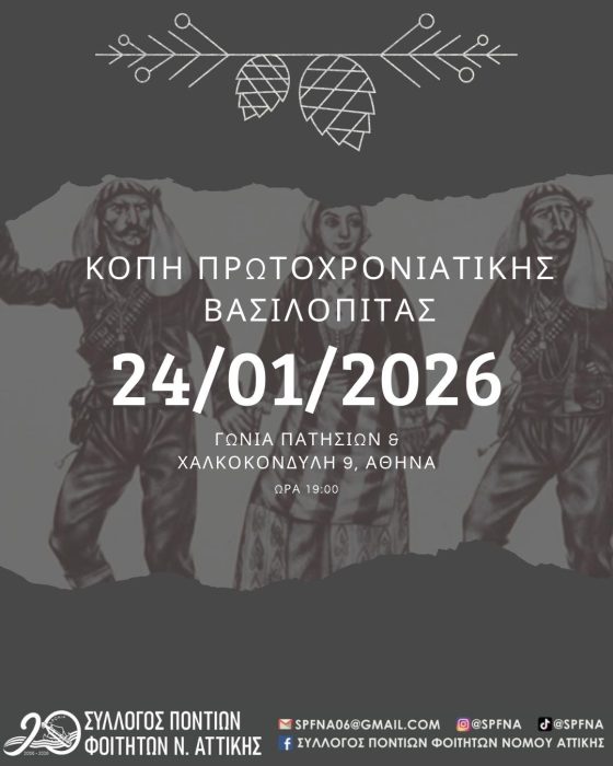 Ο Σύλλογος Ποντίων Φοιτητών Νομού Αττικής δίνει ραντεβού με τα μέλη και τους φίλους του για την κοπή της βασιλόπιτας, το Σάββατο 24 Ιανουαρίου, στις 19:00, στην οδό Χαλκοκονδύλη 9, κοντά στο μετρό Ομόνοιας (1ος όροφος).