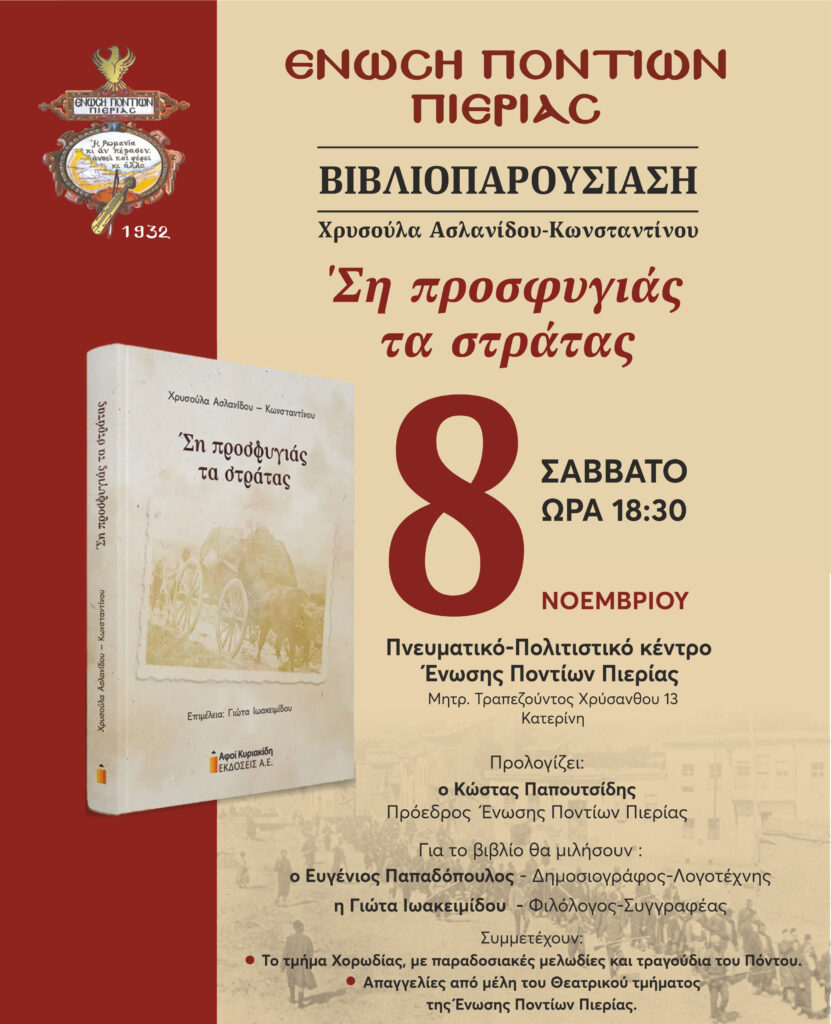 Η Ένωση Ποντίων Πιερίας διοργανώνει το Σάββατο 8 Νοεμβρίου, στις 18:30, την πρώτη παρουσίαση του νέου βιβλίου της Χρυσούλας Ασλανίδου-Κωνσταντίνου με τίτλο «Ση προσφυγιάς τα στράτας», στο Πνευματικό-Πολιτιστικό Κέντρο του συλλόγου (Μητρ. Τραπεζούντος Χρύσανθου 13, Κατερίνη).