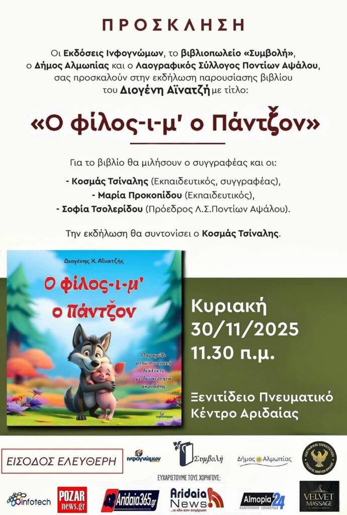 Στην Αριδαία ετοιμάζονται για μια ζεστή, πολιτιστική και βαθιά ποντιακή εκδήλωση, καθώς την Κυριακή 30 Νοεμβρίου 2025, στις 11:30 π.μ., θα παρουσιαστεί στο Ξενιτίδειο Πνευματικό Κέντρο το νέο βιβλίο του Διογένη Αϊνατζή με τίτλο «Ο φίλος-ι-μ’ ο Πάντζον».