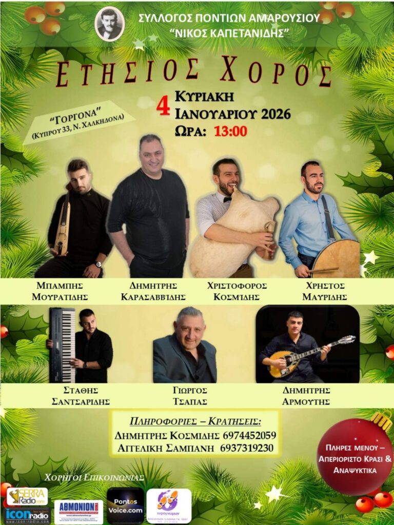 Ο Σύλλογος Ποντίων Αμαρουσίου «Νίκος Καπετανίδης» ανοίγει τη νέα χρονιά με τον Ετήσιο Χορό του, την Κυριακή 4 Ιανουαρίου 2026, στις 13:00, στο κέντρο «Γοργόνα» στη Νέα Χαλκηδόνα. Μια εκδήλωση που υπόσχεται να κρατήσει αμείωτο το κέφι μέχρι το τέλος.