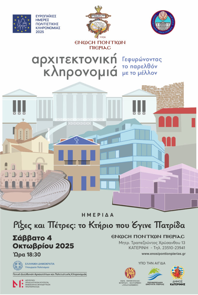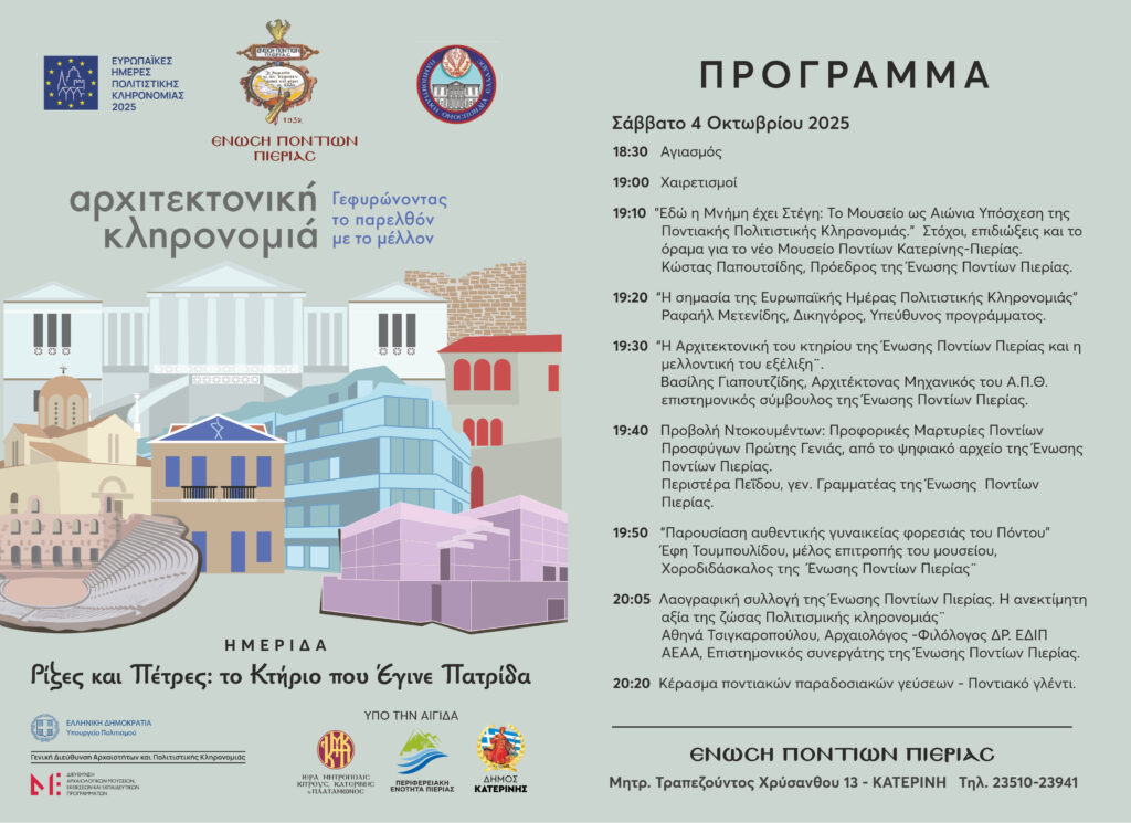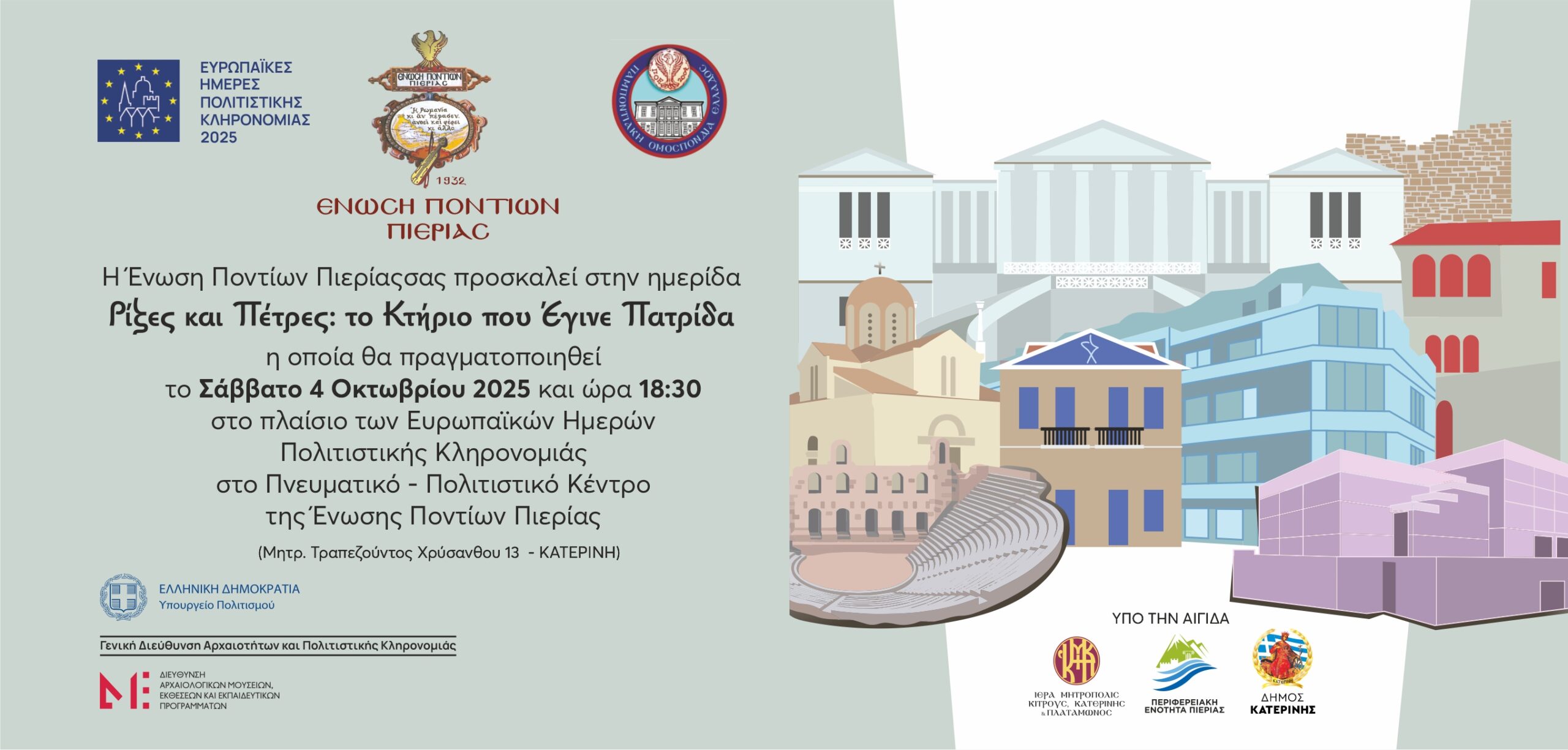 Με ιδιαίτερη τιμή και συγκίνηση η Ένωση Ποντίων Πιερίας διοργανώνει το Σάββατο 4 Οκτωβρίου 2025 την ημερίδα με τίτλο «Ρίζες και Πέτρες: Το Κτήριο που έγινε Πατρίδα», στο πλαίσιο των Ευρωπαϊκών Ημερών Πολιτιστικής Κληρονομιάς. Η εκδήλωση θα πραγματοποιηθεί στο Πνευματικό – Πολιτιστικό Κέντρο του συλλόγου, με ώρα έναρξης τις 18:30.