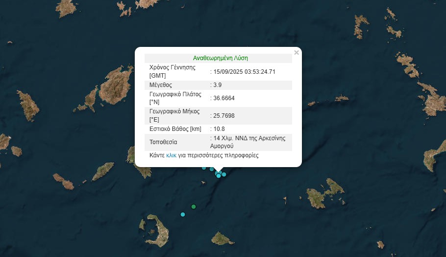 Σεισμός μεγέθους 3,9 βαθμών της κλίμακας Ρίχτερ σημειώθηκε σήμερα, Δευτέρα, το πρωί σε θαλάσσια περιοχή της Αμοργού.