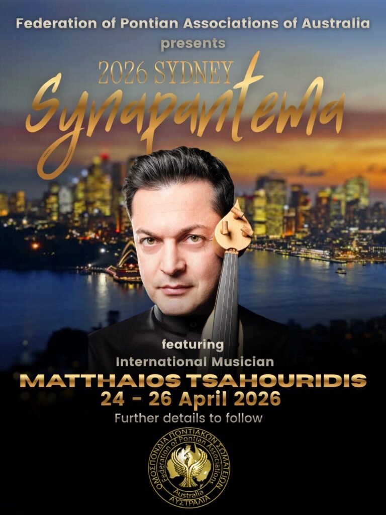 Η Ομοσπονδία Ποντιακών Σωματείων Αυστραλίας (Federation of Pontian Associations of Australia) ετοιμάζεται να βάλει το Σίδνεϊ στο επίκεντρο του απόδημου ποντιακού ελληνισμού, με το Synapantema Sydney 2026 να εξελίσσεται σε ένα από τα μεγαλύτερα ποντιακά πολιτιστικά γεγονότα της χρονιάς στην Αυστραλία. Σύμφωνα με τις τελευταίες ανακοινώσεις, το φετινό Συναπάντεμα θα συγκεντρώσει Ποντίους από όλη τη χώρα σε ένα πολυήμερο πρόγραμμα πολιτιστικών, κοινωνικών και επετειακών δράσεων από τις 24 έως τις 27 Απριλίου στο Σίδνεϊ. Η Ομοσπονδία, η οποία εκπροσωπεί εννέα ποντιακά σωματεία σε ολόκληρη την Αυστραλία, παρουσιάζει το Συναπάντεμα ως την κορυφαία ετήσια συνάντησή της, που αλλάζει Πολιτεία κάθε χρόνο και έχει στόχο να ενισχύσει τους δεσμούς της κοινότητας και να κρατήσει ζωντανή την ποντιακή ταυτότητα.