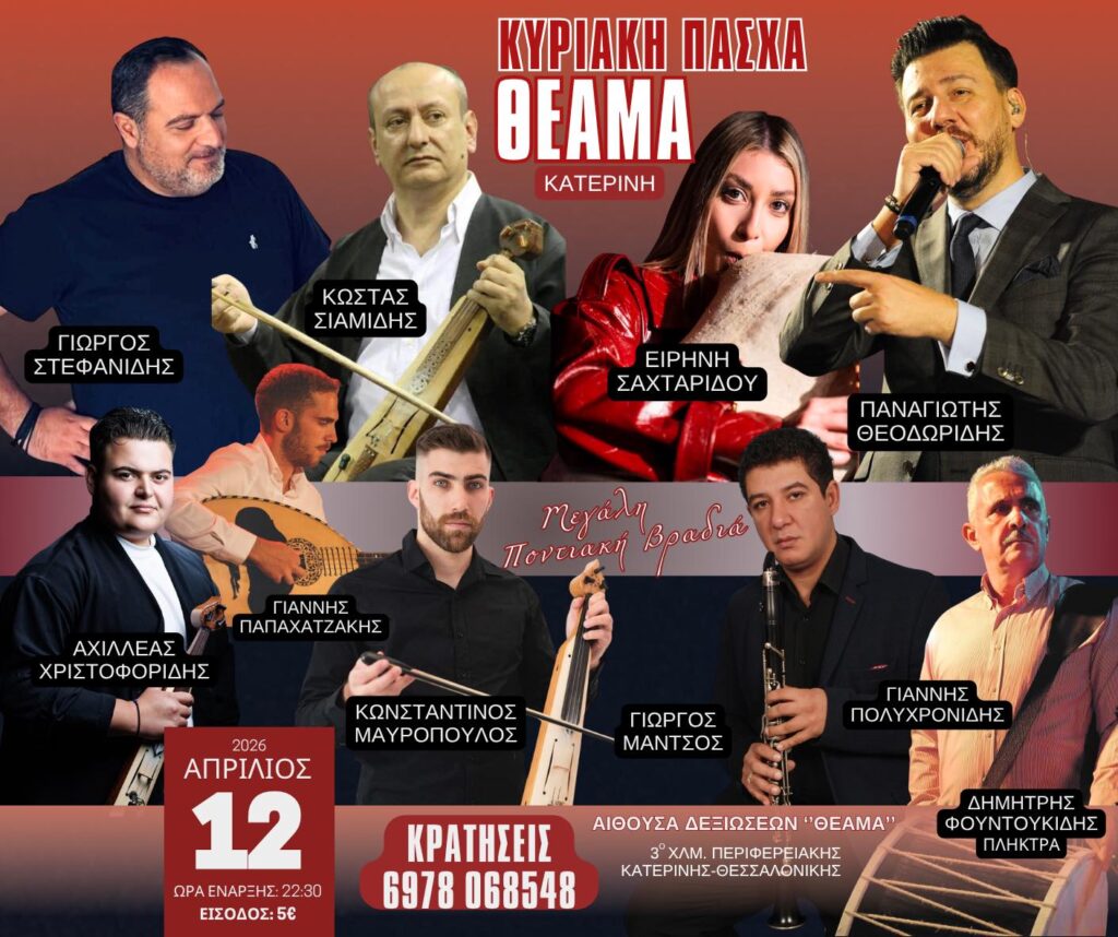 Η Κυριακή του Πάσχα στην Κατερίνη γίνεται σημείο συνάντησης για όλους τους φίλους της ποντιακής μουσικής. Στην αίθουσα «ΘΕΑΜΑ» στήνεται μια μεγάλη ποντιακή βραδιά με δυνατές συμμετοχές και αυθεντικό γλέντι μέχρι το πρωί.