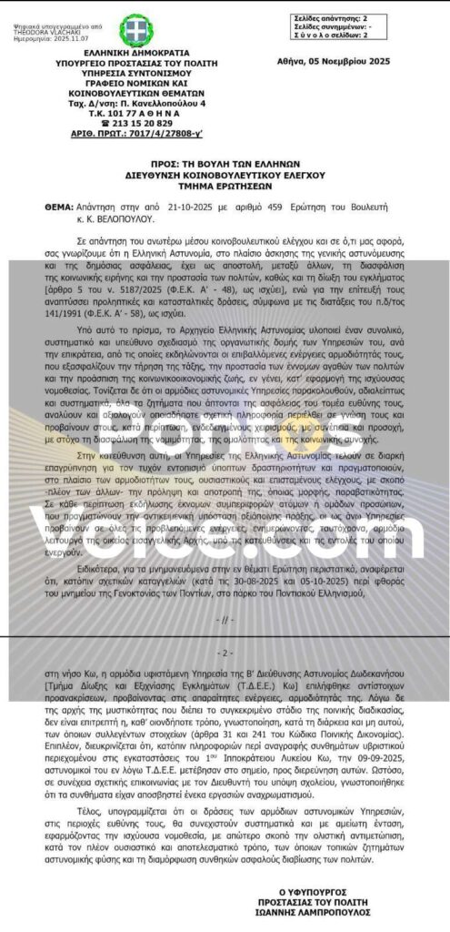 Η Ελληνική Αστυνομία απάντησε στη Βουλή σχετικά με την ερώτηση του βουλευτή Κ. Βελόπουλου (21/10/2025, αριθμ. 459), δίνοντας το πλαίσιο των ενεργειών της για ζητήματα δημόσιας τάξης, πρόληψης και καταστολής παραβατικότητας, αλλά και για συγκεκριμένο περιστατικό στη νήσο Κω, που συνδέθηκε με την προφορά μνημείου της Γενοκτονίας των Ποντίων.