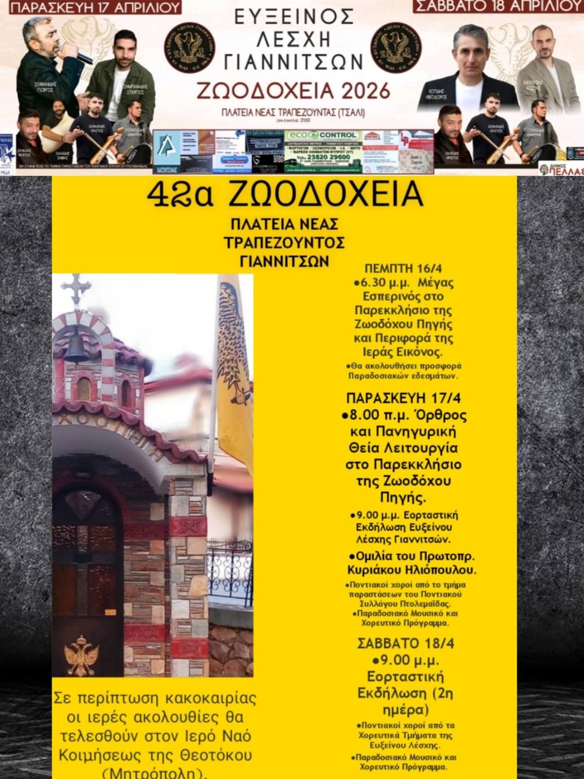 Σε κλίμα βαθιάς κατάνυξης αλλά και έντονης πολιτιστικής δραστηριότητας θα πραγματοποιηθούν φέτος τα «Ζωοδόχεια 2026» στα Γιαννιτσά, με επίκεντρο την πλατεία Νέας Τραπεζούντας (Τσαλί). Η Εύξεινος Λέσχη Γιαννιτσών διοργανώνει ένα τριήμερο εκδηλώσεων, συνεχίζοντας μια πορεία που κρατά δεκαετίες.